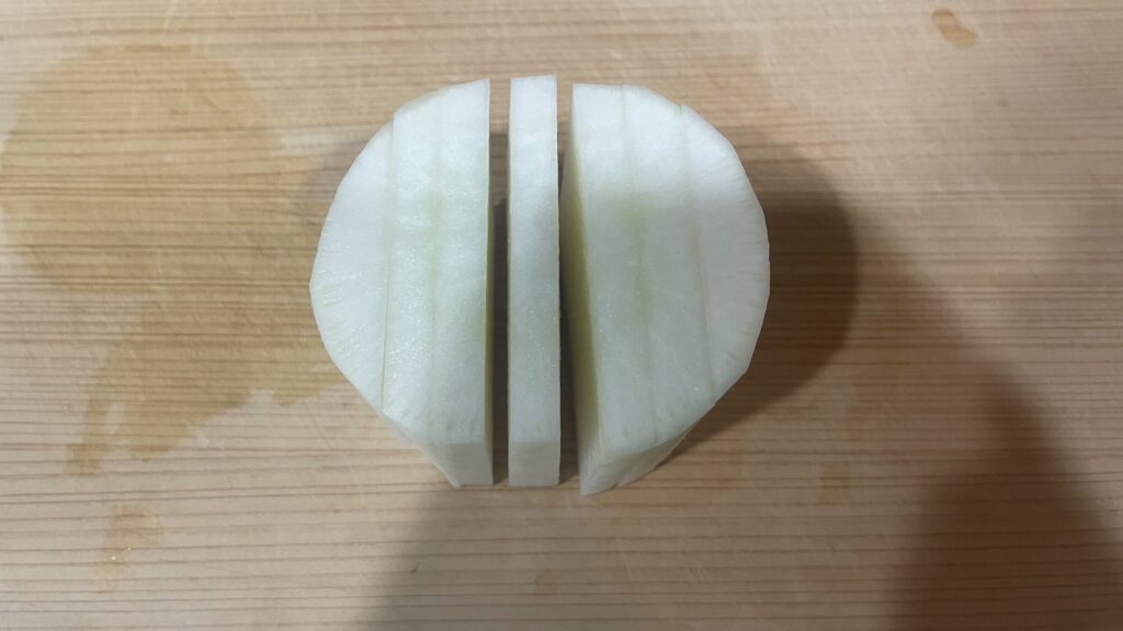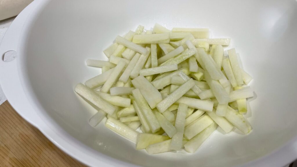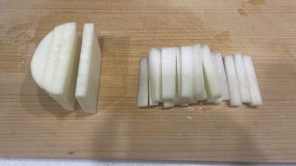 ⒈大根→皮を剥き、1cm幅の拍子切りにする。