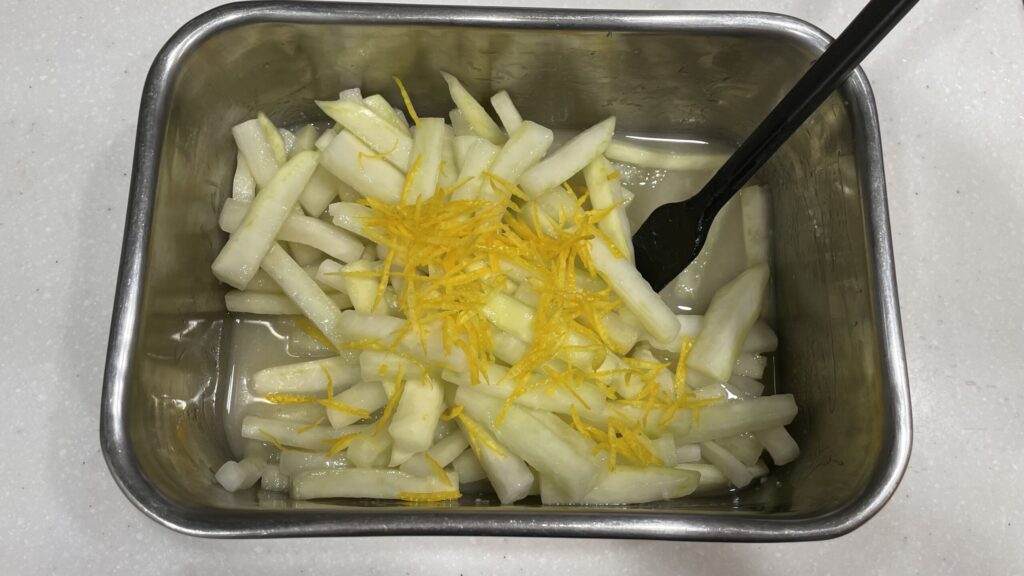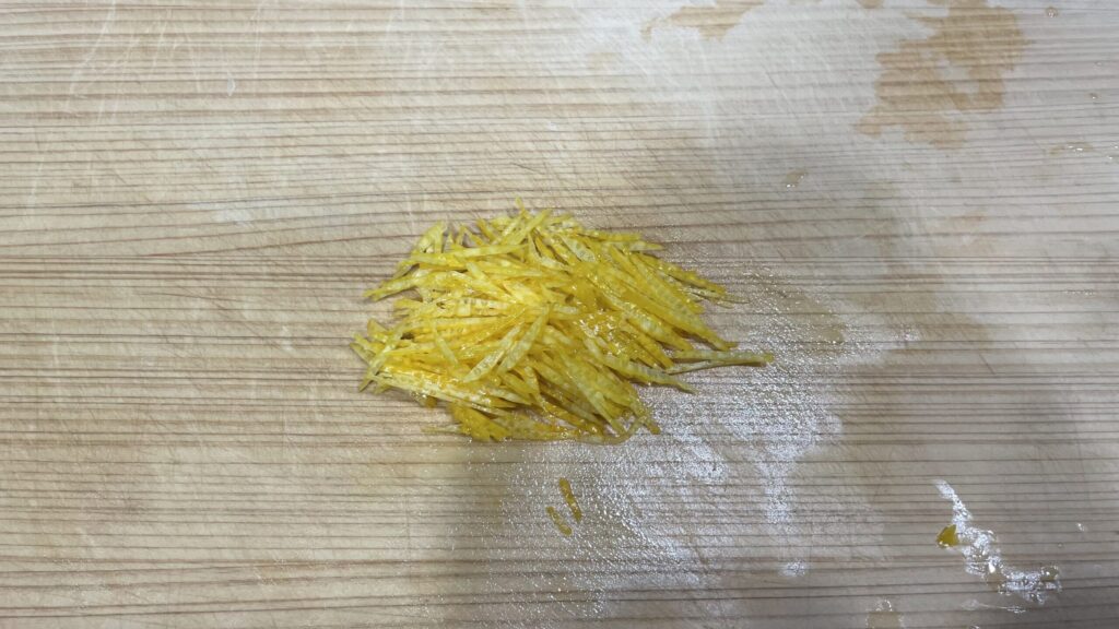 ⒉ゆず→皮をよく洗い、皮を剥き、細く千切りにする。(柚子の皮は白い部分に苦味があるので、できるだけ薄く剥く)