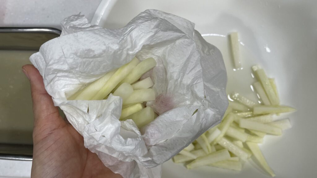 ⒋水気が出た大根を絞り、キッチンペーパーで水分を拭き取り、③に入れる。
