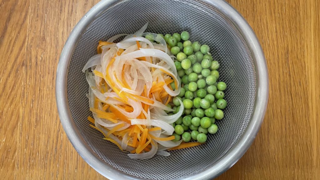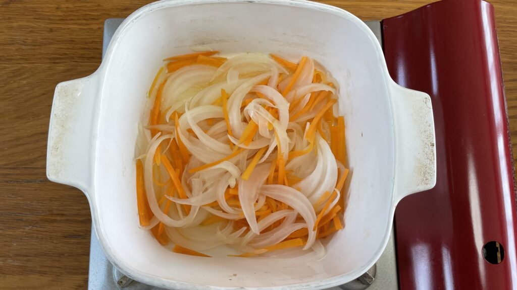 人参、玉ねぎは、少しの水で蒸し煮する。