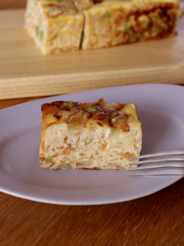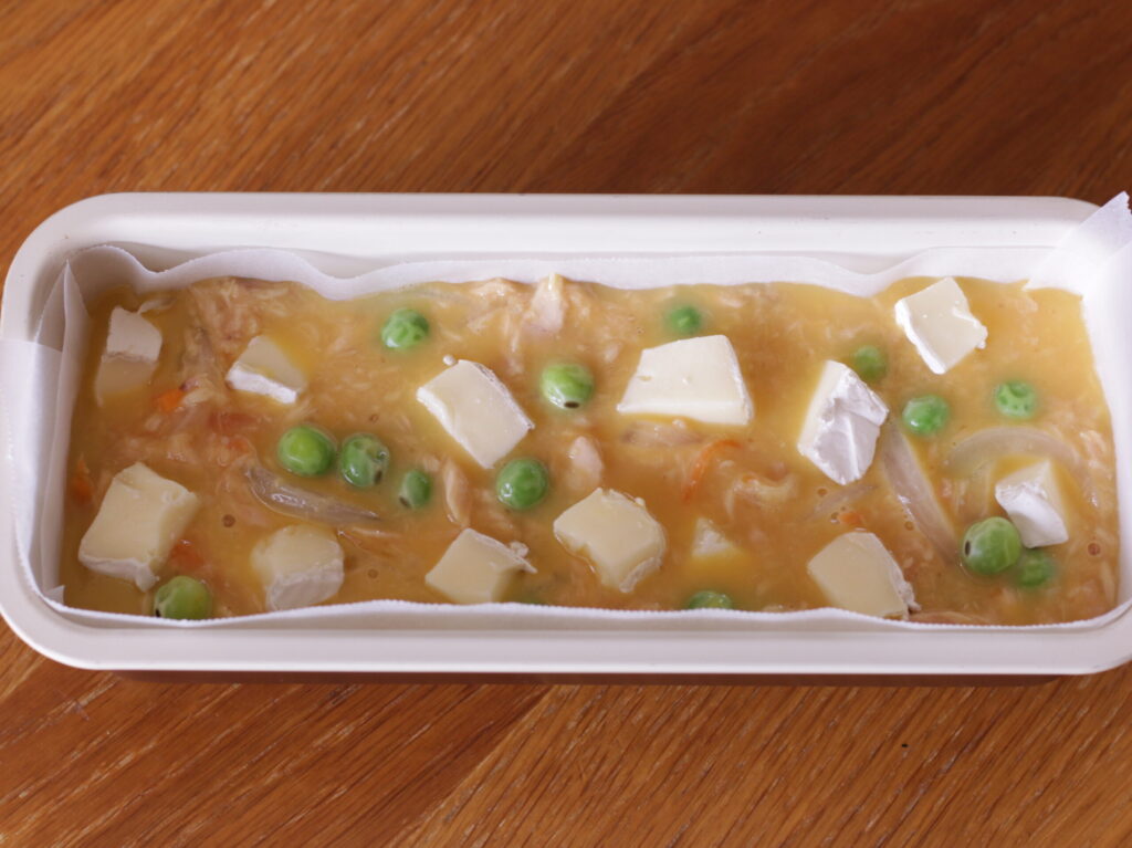 ⒊耐熱容器に①を入れ、②を流し入れ、カマンベールチーズを加えて170度で40分焼く。