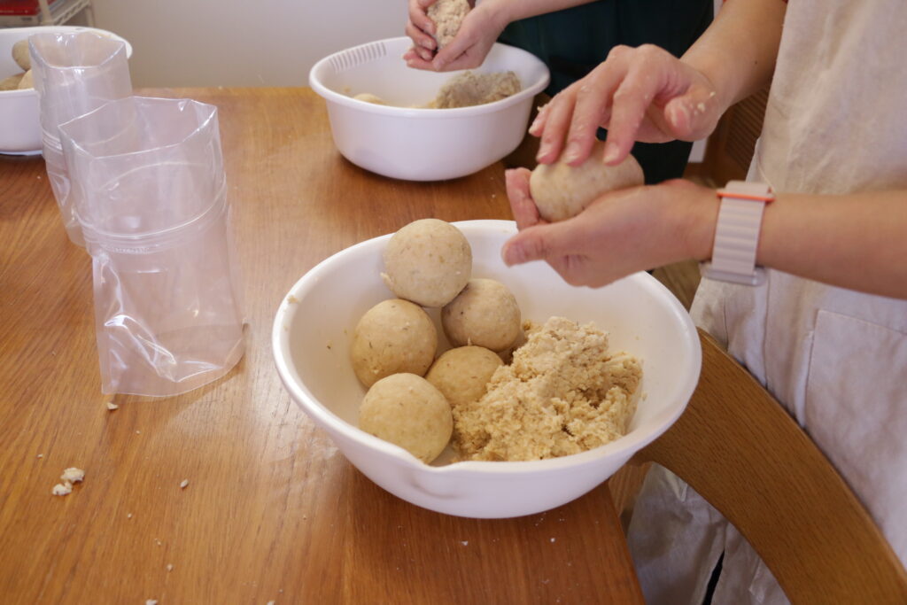 手のひらでお味噌を丸めながら、