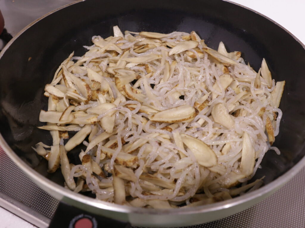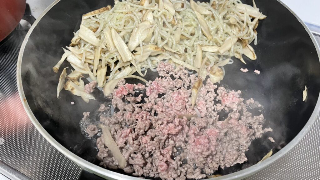 ⒉フライパンにごま油を熱し、ごぼうを中火で3分ほど炒め、糸こんにゃくを加えて2分ほど炒める。ごぼうがしんなりしたら、端に寄せ、ひき肉を加えてほぐしながら炒める。