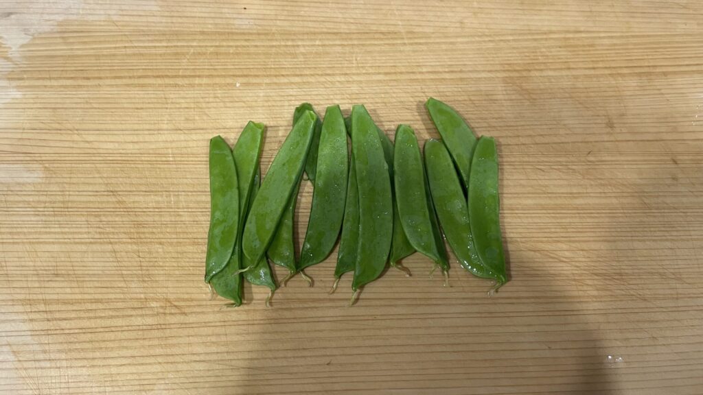 絹さや→筋を取り除いて、さっと茹で、斜め薄切りに切る。