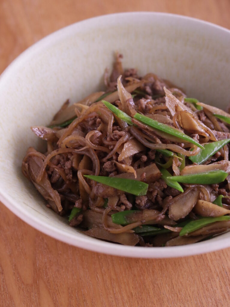 ⒊肉の色が変わったら、調味料を加え汁気がなくなるまで炒め煮にする。最後に茹でた絹さやを加えて混ぜ合わせ完成。