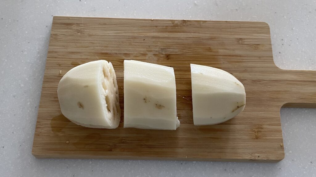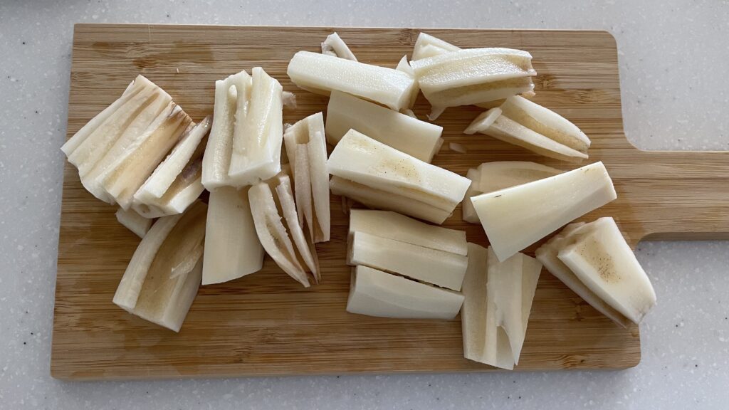 ⒈れんこんは3cm程度の長さに切り、穴を上に向けてまな板に置き、1センチ角の棒状に切り、酢水にさらします。