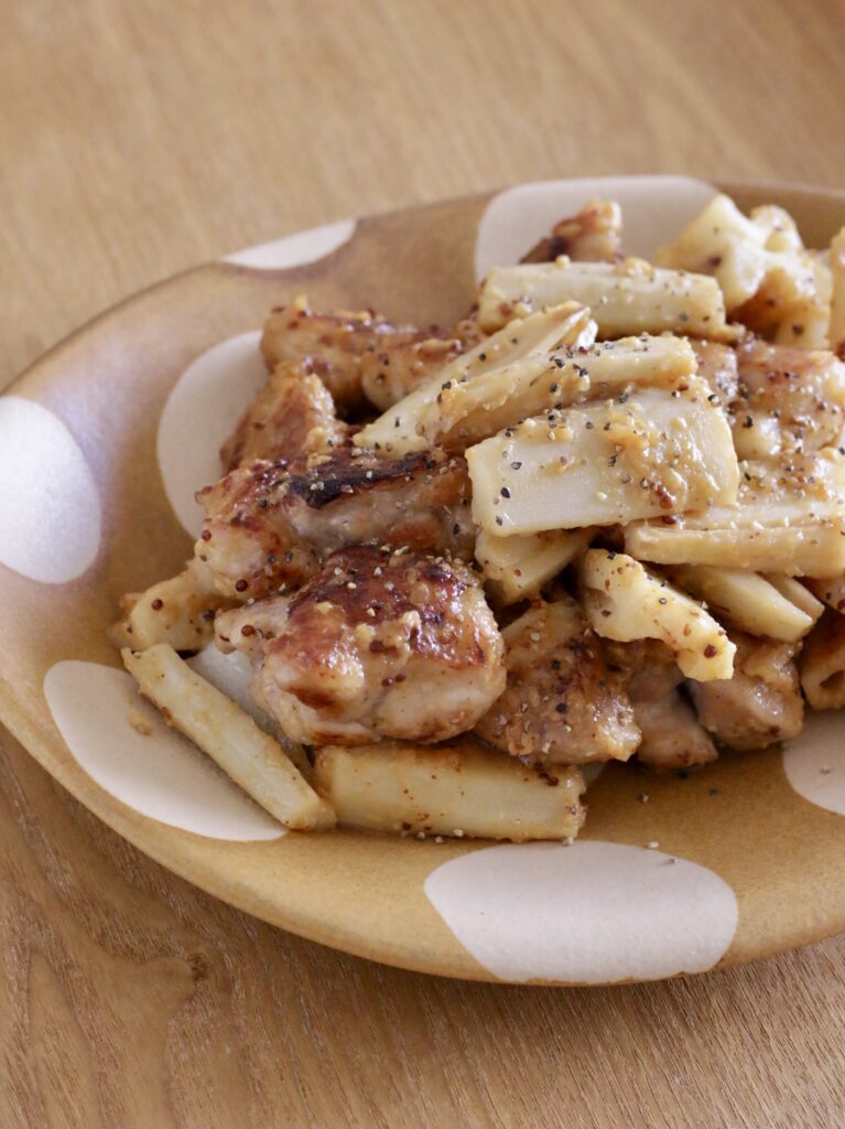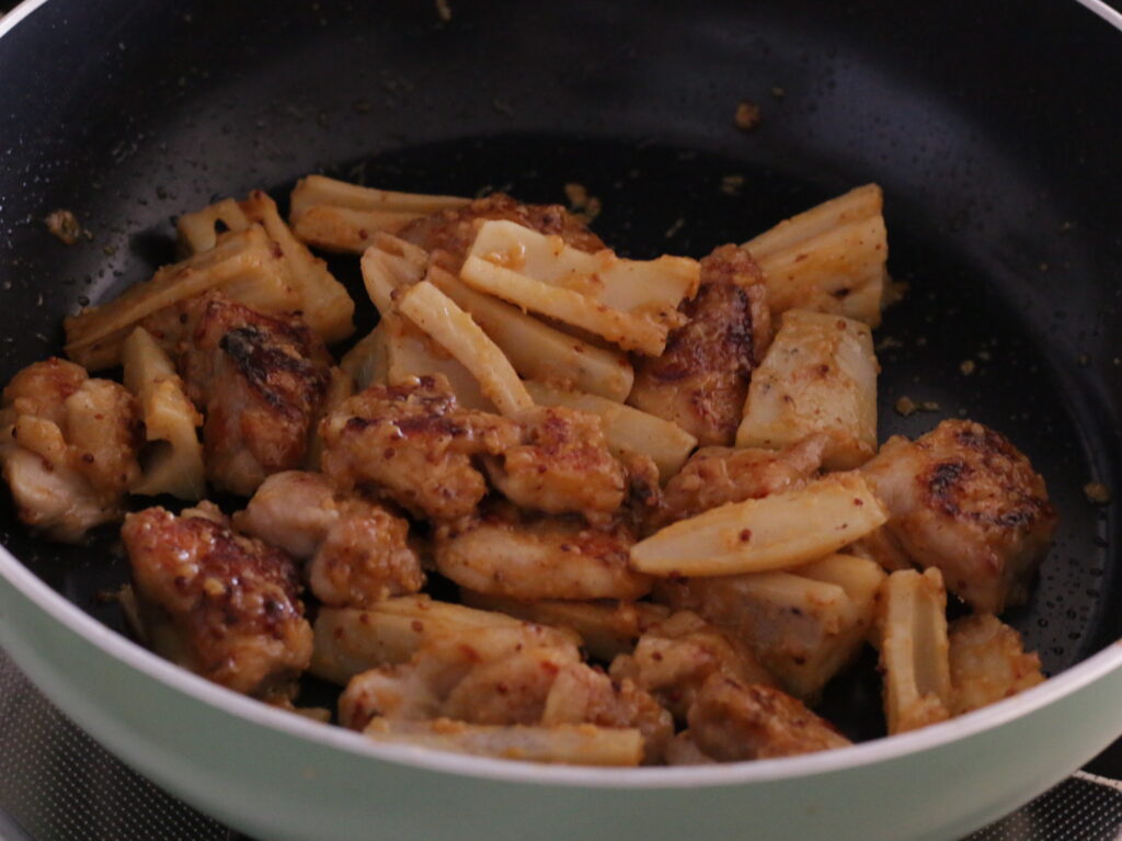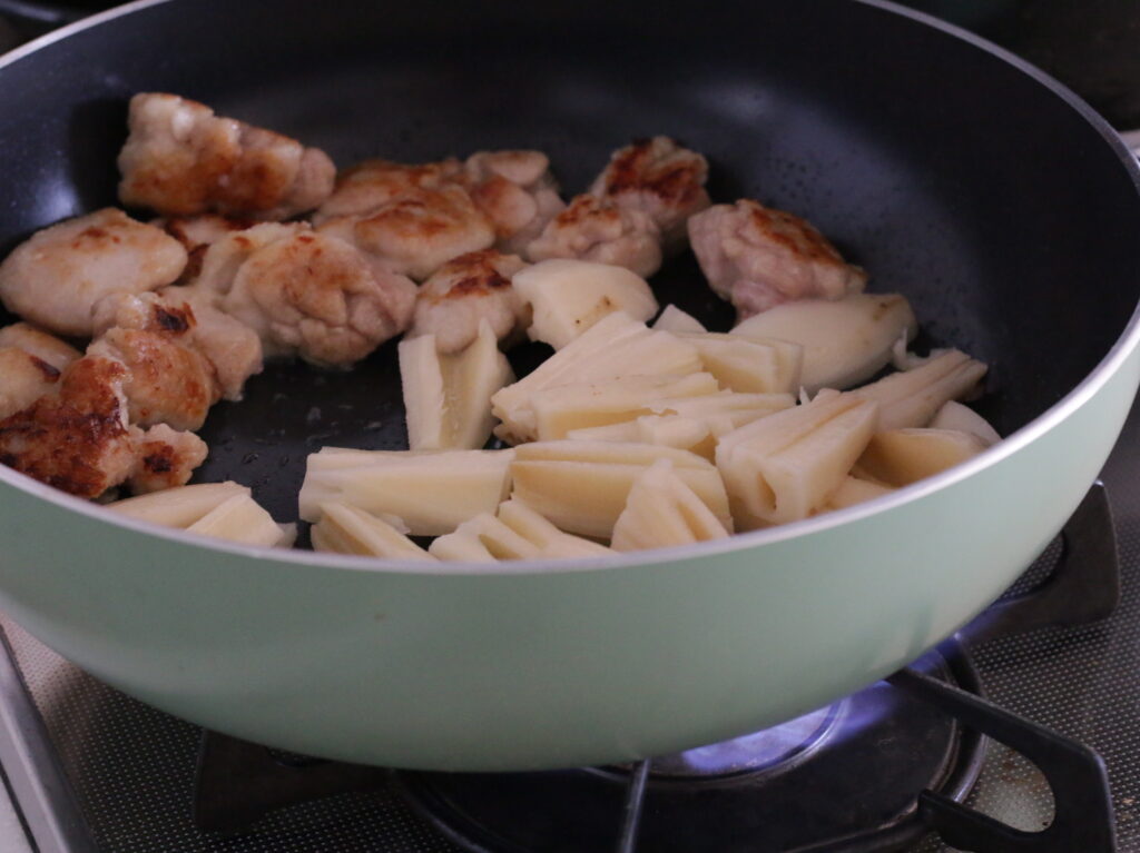 鶏肉を端に寄せ、よく水気をふいたれんこんを加え3分ほど焼きます。